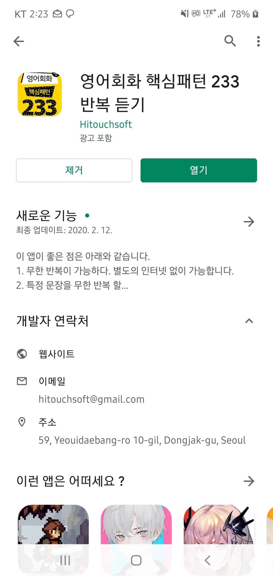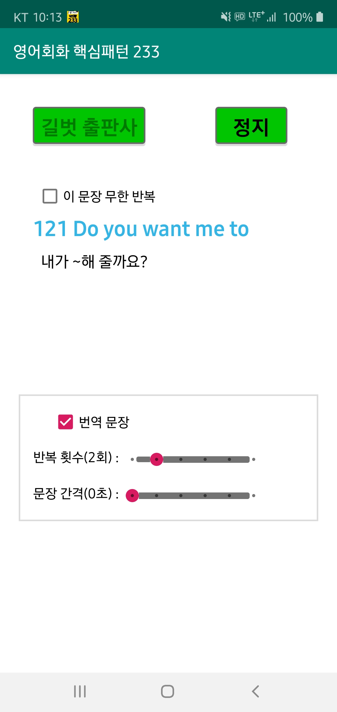 먼저 본 내용은 길벗 출판사의 영어회화 핵심패턴 233 교재 및 MP를 기준으로 제작이 되었습니다. 이에 대해서 길벗 출판사에서 일부 활용 가능에 대해서 답변을 주셨고, 이 앱은 교재를 구입하시고 보조 도구로 사용을 해주시면 감사하겠습니다. 이 앱이 좋은 점은 아래와 같습니다. 1. 무한 반복이 가능하다. 별도의 인터넷 없이 가능합니다. 2. 특정 문장을 무한 반복 할 수 있습니다. 3. 반복 회수를 설정할 수 있습니다. 4. 문장 가격을 조정하여 쉐도잉
